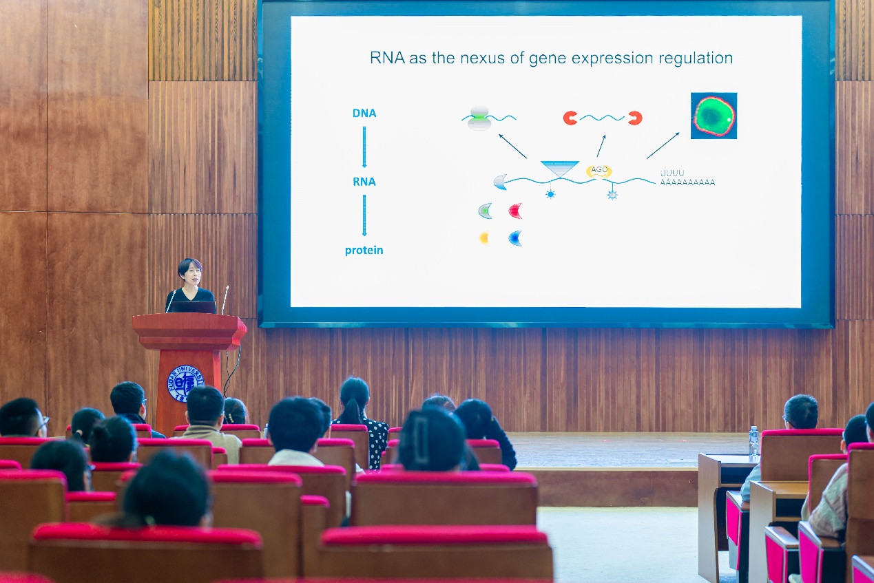 聂明副院长主持并致欢迎辞,介绍了陈雪梅教授杰出的科研工作。陈教授1988年从北京大学生科院本科毕业后同年通过考取中美生物化学联合招生项目CUSBEA的方式被录取到美国康奈尔大学攻读博士;1995年博士毕业后在加州理工学院从事博士后研究;陈教授1999年在美国罗杰斯大学建立自己的实验室。陈教授实验室的研究起始于植物花发育的遗传调控机制研究,早期的工作鉴定了多个花发育经典ABC模型的核心因子,并给自己发现的基因命名为HUA1和HUA2,源自中国传统汉字的拼音。在研究花发育的过程中陈教授是最先在植物体中分离出小RNA的研究团队之一。首次发现小RNA在3’末端核糖基上带有甲基化修饰,并克隆负责该修饰的酶HEN1,证明该修饰对于维持小RNA的稳定非常重要,为小RNA领域的重要发现之一;首次证明植物中miRNA介导靶基因的翻译抑制过程发生在内质网上。基于在小RNA领域这一系列原创性的科研成果,陈教授先后获得美国植物学会Charles Albert Shull奖、美国HHMI研究员、美国戈登与贝蒂莫尔基金会研究员;当选美国科学促进会会士、美国国家科学院院士。
