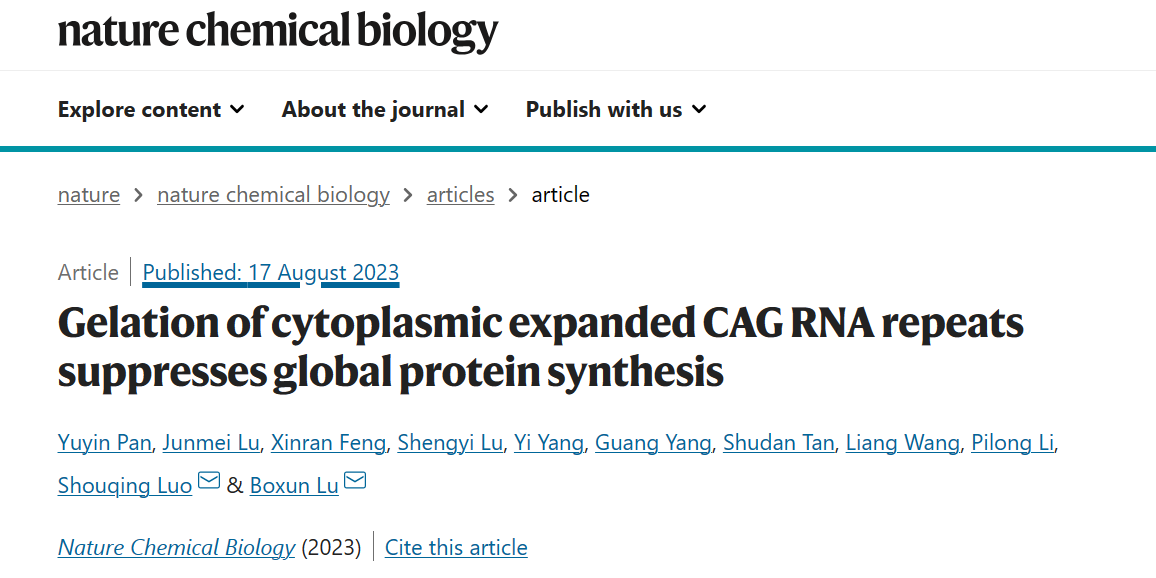 2023年8月17日,风车动漫 鲁伯埙课题组同合作者英国普利茅斯大学罗寿青、清华大学李丕龙等在Nature Chemical Biology杂志上发表题为Gelation of cytoplasmic expanded CAG RNA repeats suppresses global protein synthesis的文章,证实了包含过长CAG重复序列的RNA在细胞质内的胶体化,并发现该胶体化过程可通过“囚禁”重要的翻译延伸因子eEF2从而导致细胞全局蛋白质合成速度的下降。研究进一步在动物实验中提示含过长CAG重复序列RNA的胶体化可能导致神经退行性疾病相关的表型及神经电生理变化。