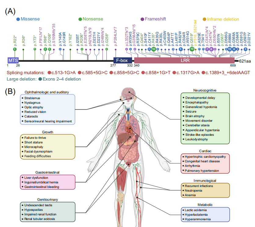 MTDPS13相关症状广泛,个体差异很大,最常见症状包括张力减退、神经发育迟缓和乳酸血症等。具有高能量需求的器官,如大脑、心脏、肌肉和肾系统,通常会受到更严重的影响。患者预后通常较差,平均3岁时死亡率约为30%。MTDPS13致病基因FBXL4是一个Cullin 3家族E3泛素连接酶复合体的底物识别亚基。自2013年首次描述FBXL4基因致病突变以来,在112例常染色体隐性遗传患者中共记录了59种致病突变。与双等位基因缺失突变的患者相比,双等位错义突变、错义/缺失突变复合杂合性患者往往生命更长。这一观察结果意味着错义变体可能在这些个体中发挥亚等位基因效应。