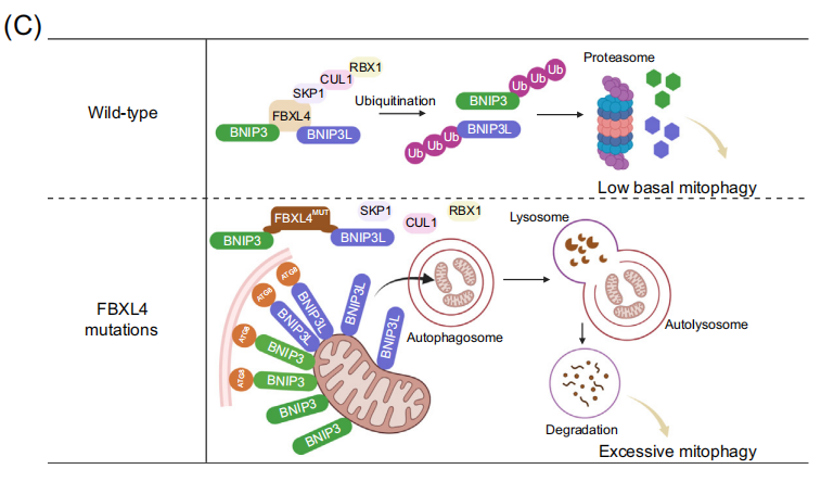 2023年发表的多项研究在该病的分子机理方面取得重大进展,阐明了FBXL4通过控制线粒体外膜自噬受体BNIP3和BNIP3L来抑制基础线粒体自噬(basal mitophagy)的关键作用。线粒体外膜蛋白BNIP3和BNIP3L具有LIR基序,能够与自噬体ATG8家族蛋白相互作用,启动线粒体自噬。FBXL4也定位于线粒体外膜,介导BNIP3/BNIP3L的泛素化-蛋白酶体途径降解,使其维持本底低水平表达。而FBXL4缺乏则导致BNIP3/BNIP3L的大量积累,在培养的细胞系、MTDPS13患者的皮层神经元和FBXL4敲除/敲入小鼠模型中,FBXL4失活可触发高水平的基础线粒体自噬。FBXL4与其他外膜线粒体自噬受体,如PHB2、NIPSNAP1和FUNDC1没有相互作用。此外FBXL4缺乏诱导的线粒体自噬不依赖于经典的Parkin-PINK1途径。有趣的是,尽管FBXL4错义突变位点集中在负责和底物识别的LRR结构域,但这些突变并不影响FBXL4与BNIP3/BNIP3L的相互作用,而使其与复合体其他亚基如Skp1、Cullin1和RBX1的相互作用显著降低,出现活性CRL1FBXL4复合体的组装障碍,显著降低了对BNIP3/BNIP3L的泛素化降解作用。目前动态调控该过程的上游信号事件仍在探索中。