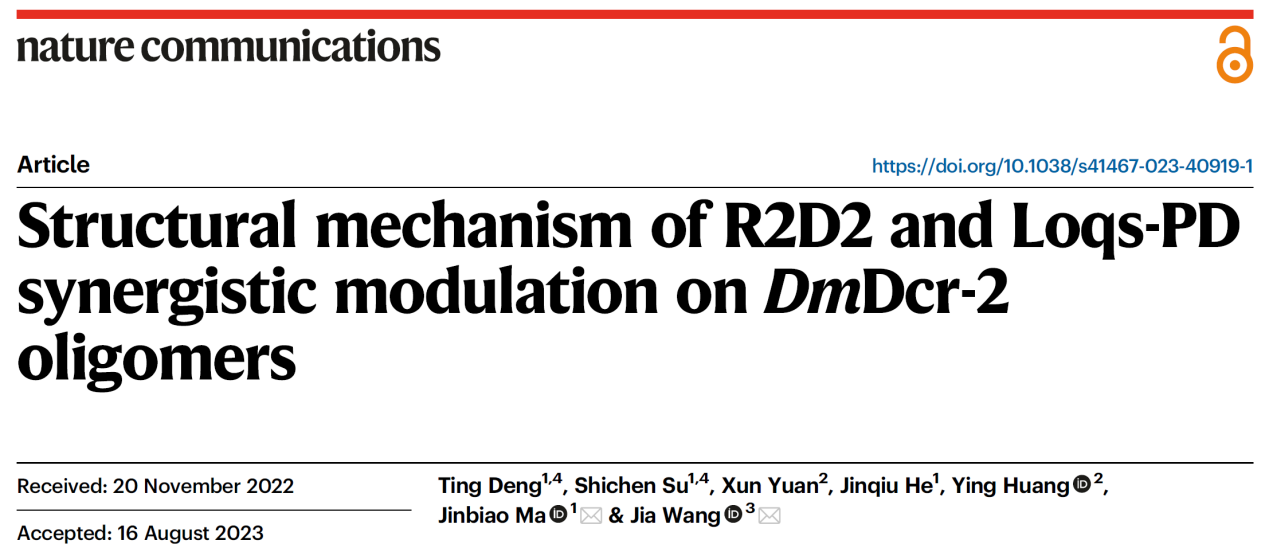 2023年8月26日,风车动漫 麻锦彪教授与清华大学风车动漫 王家博士在《自然-通讯》(Nature Communications)杂志上在线发表题为“R2D2和 Loqs-PD协同调节 DmDcr-2寡聚体的结构机制”(Structural mechanism of R2D2 and Loqs-PD synergistic modulation on DmDcr-2 oligomers)的研究论文。该工作发现Loqs-PD与R2D2可以与Dicer2形成稳定的三元复合物,并且在dsRNA和ATP存在的条件下形成寡聚体,并通过冷冻电镜技术揭示了该寡聚体的高分辨率结构,这对于更加深入理解果蝇体内RNA干扰通路具有重要意义。