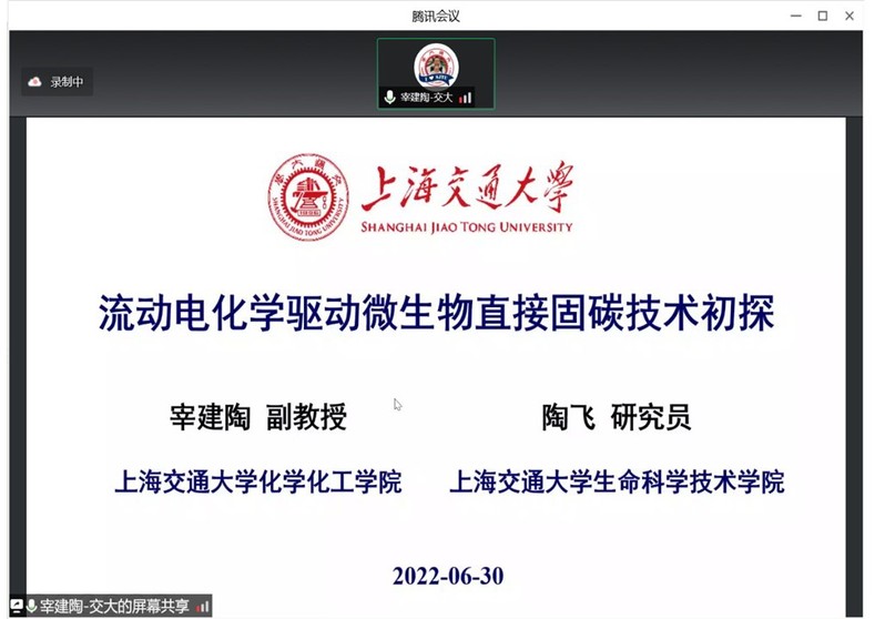 2018级星友、上海交通大学宰建陶副教授(并代表2018级星友、上海交通大学陶飞研究员)在报告中介绍了他和陶飞俩星友通过化学和合成生物学的学科交叉,成功将析氧反应与铁硫杆菌固碳合成耦合,直接固定大气中的CO2的流动电化学微生物培养系统(EMCF)。该系统无需CO2富集、无毒害气体和副产物排放,能效和环保安全性强。鉴于前期探索研究已证实该技术是可行并具有优异负碳经济价值;下一步需要在装备制造、系统集成和微生物驯化改造等方面开展更深入的研究和示范,系统评估其碳减排、社会和经济效益。宰建陶、陶飞星友希望得到政府和钢铁等企业的资金和应用场景支持。