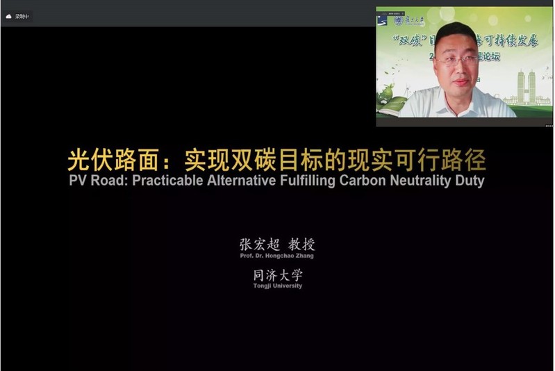 2010级星友、同济大学张宏超教授在报告中结合他们在2017年建成的世界首条光伏路面高速公路试验段的实践,提出以碳中和、碳达峰和车路协同为目标的“光伏路面”技术是新能源与交通建设跨界融合、密切关联的具有典型性、创新性、示范性的新技术,是为实现“双碳”目标做出的重要探索。尽管前景广阔,但要使这个创新实践能进一步落地生根,亟需主管部门在科研立项、项目落地等方面给予扶持。