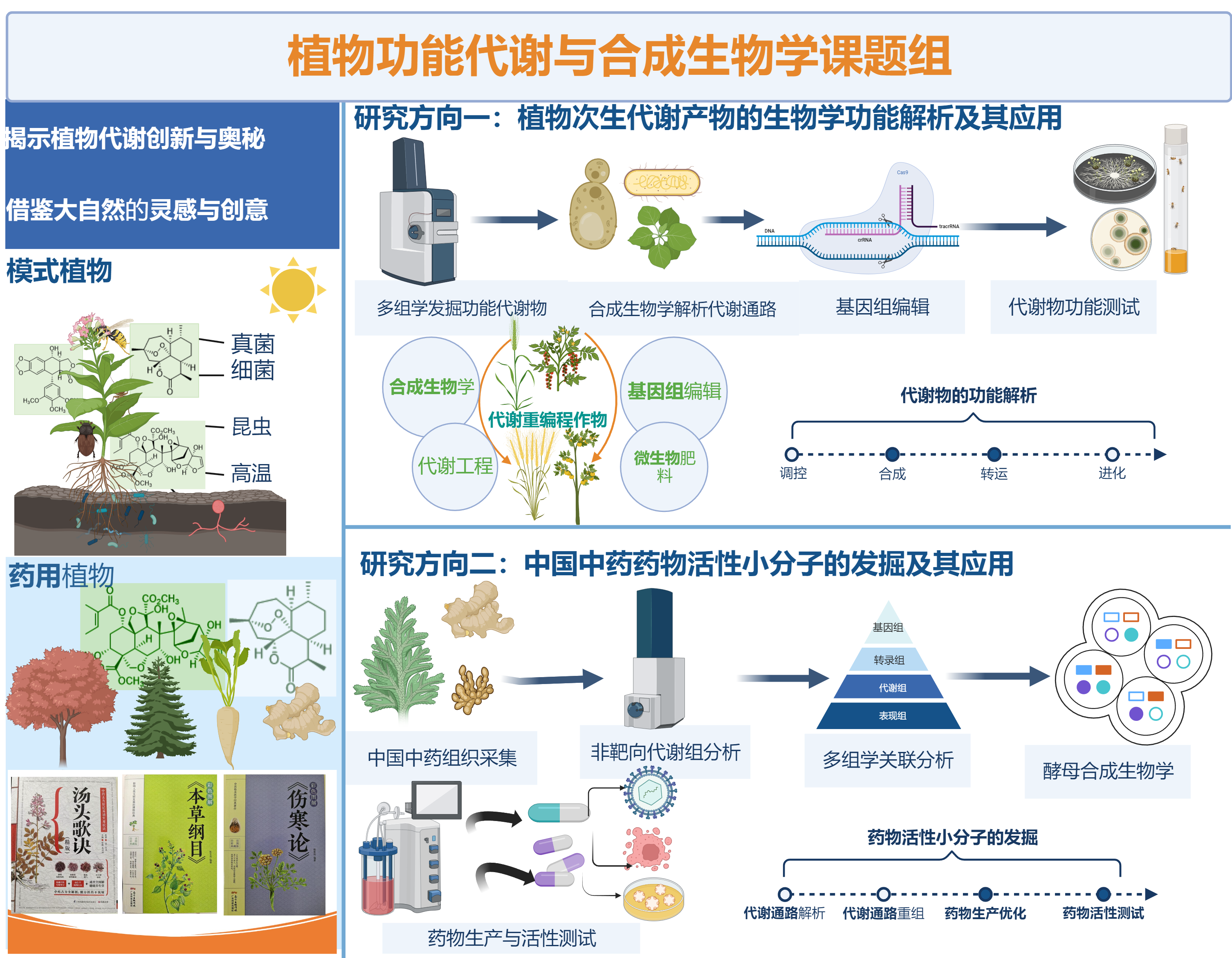 气候变化与健康危机是当前人类面临的两大棘手问题,它们相互独立却又时常交织在一起为人类社会的发展带来多重危机。积极发展新型的生物经济技术手段为人类提供绿色食品、健康医药和清洁能源成为应对当下危机的关键。植物次生代谢产物的高效药物活性、营养保健和重要生理生态功能已促使其成为发展生物经济的重要研究对象。合成生物学、基因组编辑、代谢工程以及植物代谢组学的高速发展为植物次生代谢研究提供了重要的技术支撑。植物可以合成结构多样、物种独有以及细胞特异的植物次生代谢物,然而,大部分植物次生代谢物的生物学功能都仍然未知。我们课题组主要有以下两个研究方向: