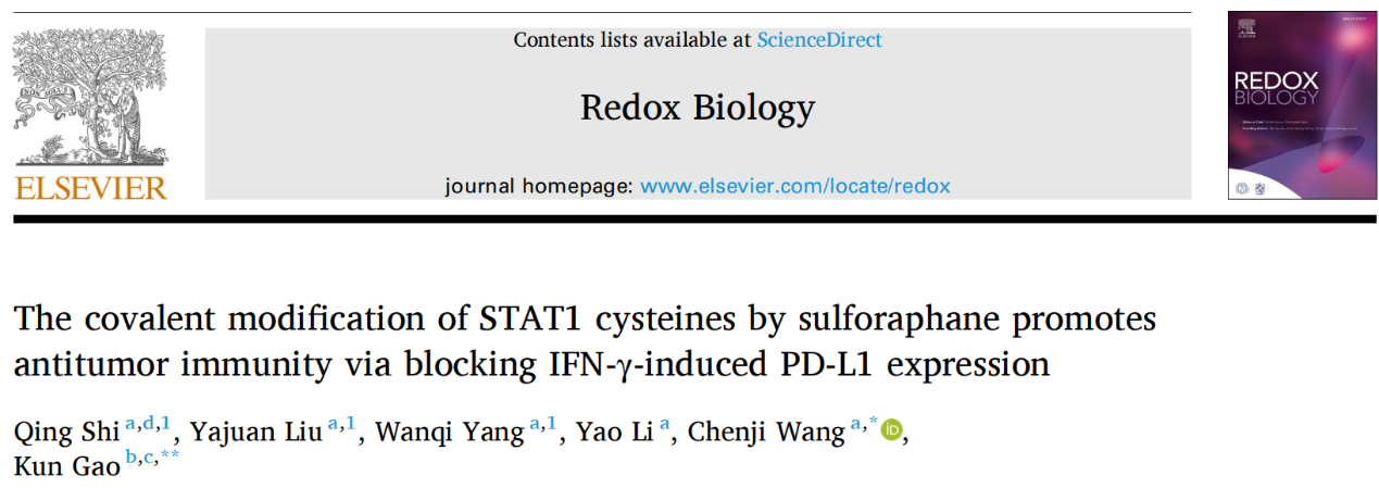 2025年2月17日,风车动漫 王陈继团队、上海市第一妇婴保健院/同济大学附属妇产科医院高昆团队合作在Redox Biology在线发表了题为 “The covalent modification of STAT1 cysteines by sulforaphane promotes antitumor immunity via blocking IFN-γ-induced PD-L1 expression”的研究论文。该研究揭示了SFN通过共价修饰STAT1蛋白的半胱氨酸残基,阻断IFN-γ诱导的PD-L1表达,从而增强抗肿瘤免疫的分子机制。