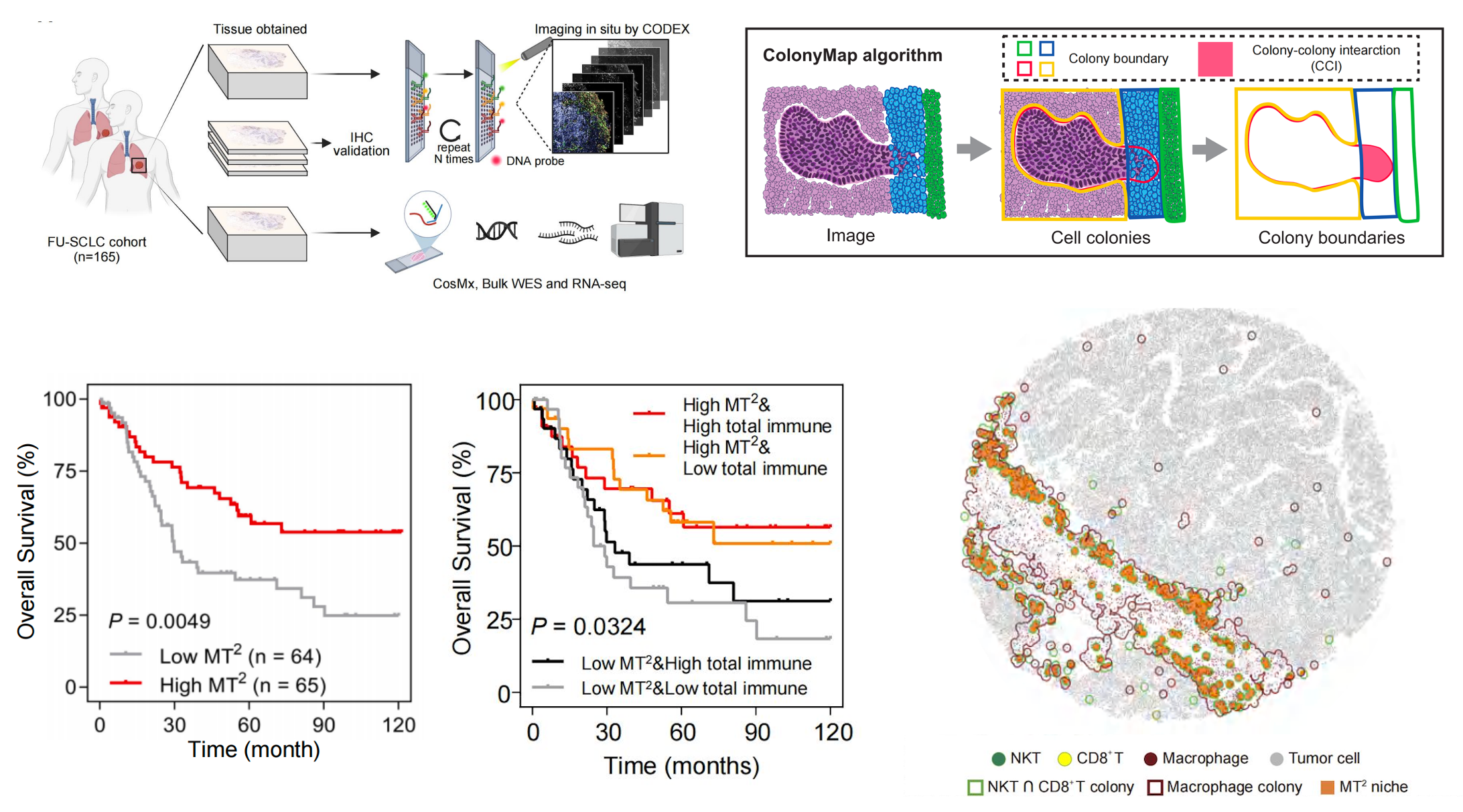 2025年2月20日,我院曹志伟教授团队与复旦附属肿瘤医院陈海泉教授团队联合在《Cancer Cell》杂志在线发表题为”Integrative Spatial Analysis Reveals Tumor Heterogeneity and Immune Colony Niche Related to Clinical-outcomes in Small Cell Lung Cancer”的论文。该研究通过整合空间多组学(CODEX、CosMx)和传统组学技术,系统性构建SCLC空间单细胞图谱,并从细胞互作生态学视角,创新性开发ColonyMap算法,揭示肿瘤内部高度分子异质性,发现与免疫疗效及患者预后密切相关的 “MT2”亚组织结构。
