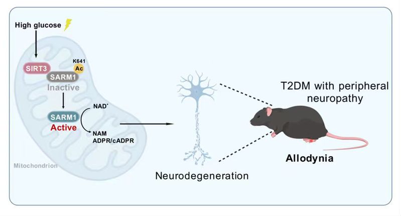 糖尿病周围神经病变(DPN)是糖尿病患者最常见的慢性并发症之一,目前临床仍缺乏针对其病理机制的有效治疗药物。轴突变性(Axon Degeneration)是DPN的核心病理特征,而SARM1作为关键的NAD+水解酶,是诱发轴突断裂的“分子开关”。然而,在糖尿病高血糖微环境下,SARM1是如何被精准激活的?这一过程背后的翻译后修饰机制此前尚不明晰。