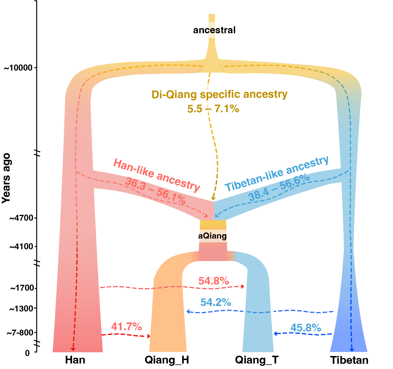通过群体混合模型推断显示,现代羌族祖先大约在4700年由以汉族为代表的古黄河血统、以藏族为代表的古藏高原血统以及羌族私有的“古氐羌”血统共同混合形成。随后,在历史时期的不同阶段,羌族内部逐渐走上两条不同的演化路径:Qiang_H在近两千年内多次接受来自汉族的基因流入,其时间节点与魏晋南北朝时期的人口迁徙以及元明时期汉人大规模迁入四川等历史事件相吻合;Qiang_T则更多地与以藏族为代表的相关人群发生基因交流,可能与吐蕃帝国扩张及其后续的藏文化传播密切相关。不对称的基因流动最终固化羌族内部的遗传分化。