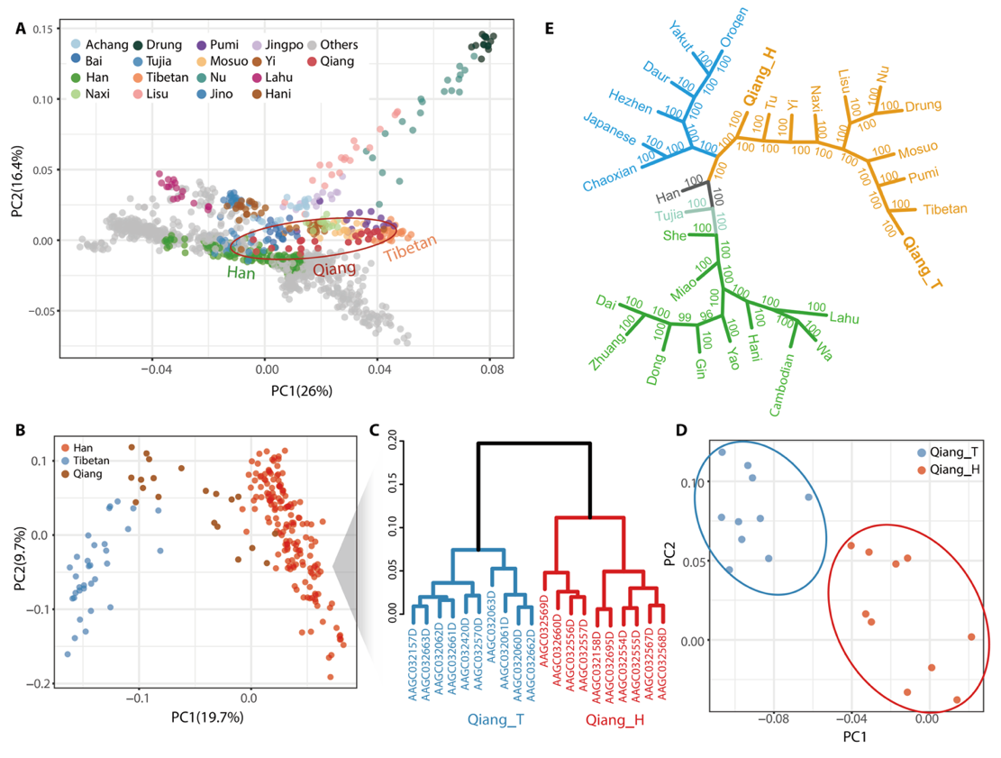 研究团队基于来自四川茂县的20名羌族个体的全基因组测序数据,结合欧亚地区已公开的现代人群和古代人群基因组数据进行系统比较分析。遗传结构分析、群体系统发育树重构和祖源构成分析结果一致表明:现代羌族在遗传上并非一个均质人群,而是清晰地分化为两个亚群。其中一支整体遗传结构更接近汉族(Qiang_H);另一支则与藏族具有更高的遗传亲和度(Qiang_T),这与历史人类学家王明珂先生早期在川西进行田野调查时发现羌族人群内部的汉化和藏化现象一致。值得注意的是,两个羌族亚群之间的整体分化程度甚至超过了中国南北汉族之间的差异。表明羌族内部存在长期稳定分化而非短期随机差异。通过基因流、祖源片段分析等手段,研究验证了汉藏间不平衡基因交流是导致羌族汉化与藏化的核心驱动力。